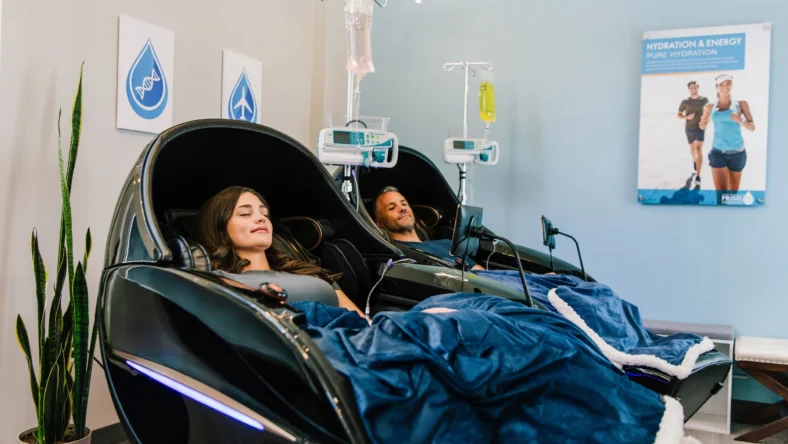 Neary launched the concept in 2017 before pivoting to a franchise model in 2020. Administered by medically trained professionals, treatments take place in a spa-like setting with zero-gravity massage chairs, soothing music, blankets, cozy socks and infused water.